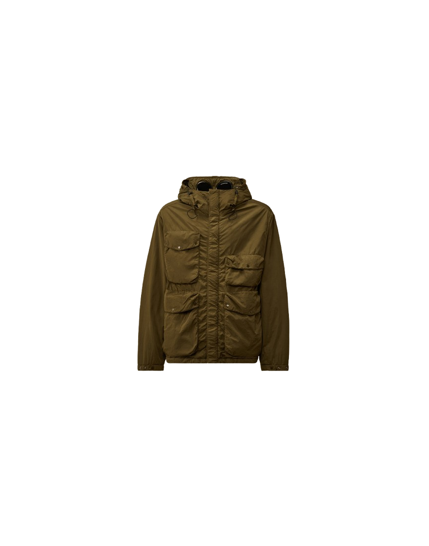 Goggle jacket realizzata in Chrome-R, un nylon multifilamento lucido e riciclato al 100%, ottenuto da scarti di lavorazione e trasformato in una nuova fibra certificata Global Recycled Standard (GRS). Il modello presenta l’iconico cappuccio con lenti Goggle di C.P. Company, chiusura full zip a doppio cursore nascosta da patta con bottoni automatici, tasche frontali con patta e polsini regolabili. Orlo con coulisse regolabile per una vestibilità personalizzata. Imbottitura in ovatta per maggiore comfort. Tinto in capo con trattamento anti-goccia. Regular fit.