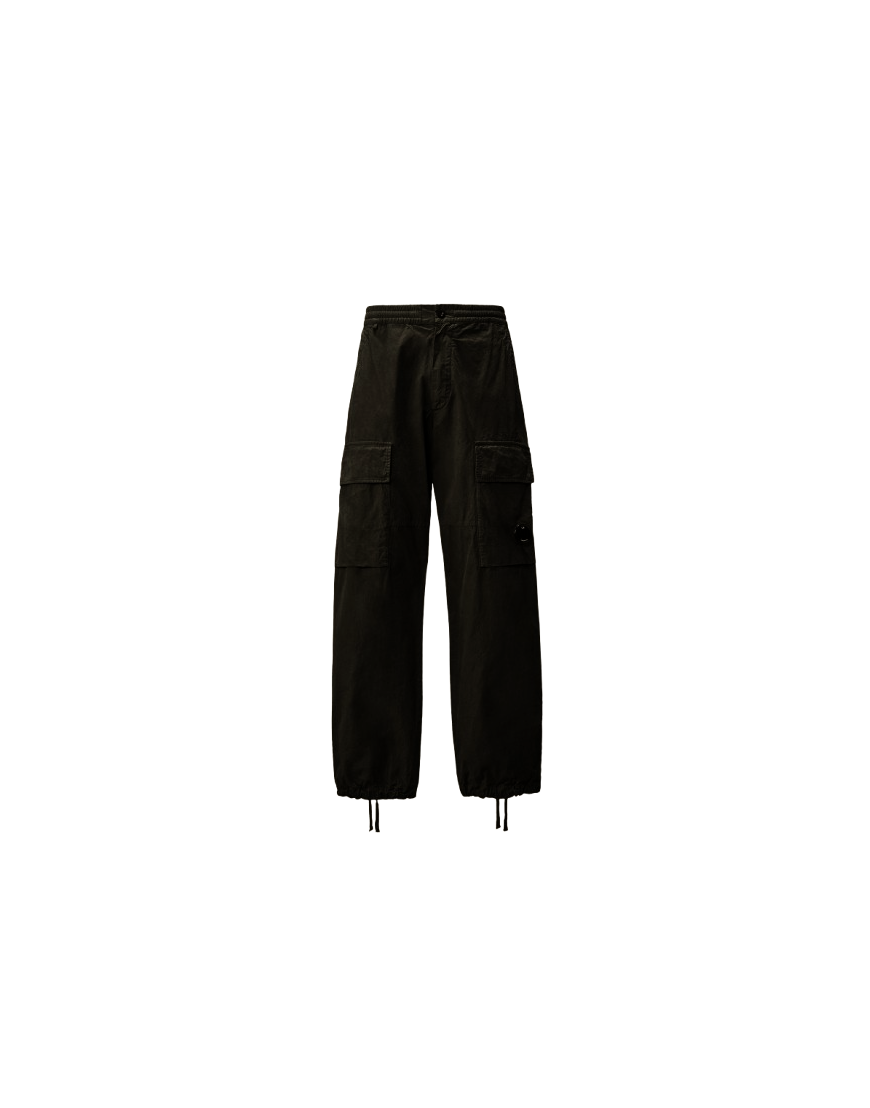 Pantaloni cargo realizzati in cotone reps, sottoposti a doppia smerigliatura tramite cilindri diamantati o al carbonio sul diritto. I pantaloni presentano l’iconica Lente di C.P. Company, chiusura con bottone e zip, vita regolabile con coulisse, tasche laterali, tasche cargo con patta e bottoni automatici e tasca posteriore con patta e etichetta applicata. Fondo gamba regolabile con coulisse. Tinti in capo. Boxy fit.
