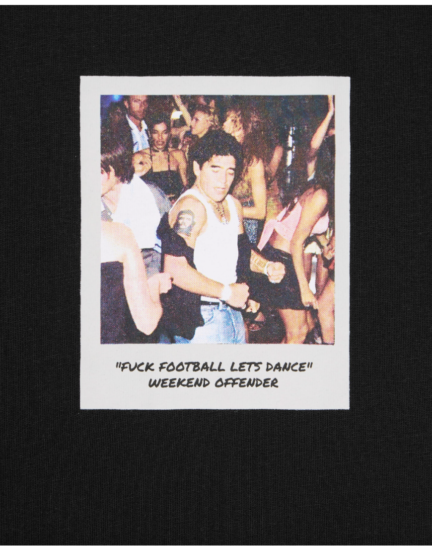 The Let's Dance Graphic Tee features a rare Polaroid photo of the legendary Diego Maradona captured while dancing in an Argentine nightclub. The snapshot offers a glimpse into the off-field life of the controversial football icon.